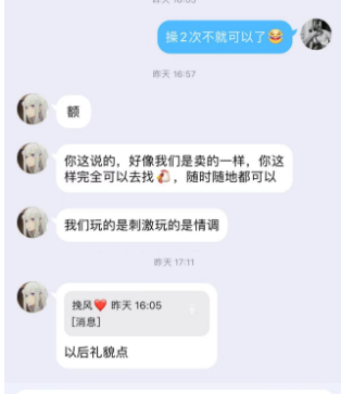 吐槽一下,从加上你得QQ,到你说过门槛,到我结束麻将局,开车到你指定得地方,在到等你2个多小时,我不曾抱怨过,一直积极与你沟通,后面你一直不回复消息,在到周三回复消息就是要钱,请吃甜品,到我拒绝,你删QQ ,删微信,最后说一句因为我说一个操2次就不礼貌了?